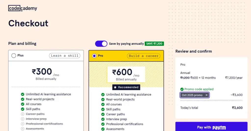 This 50% discount (Promo code: SECURE50) expires on October 21st, 2025. Don’t miss this opportunity to enroll in Codecademy Pro at a significantly reduced price.