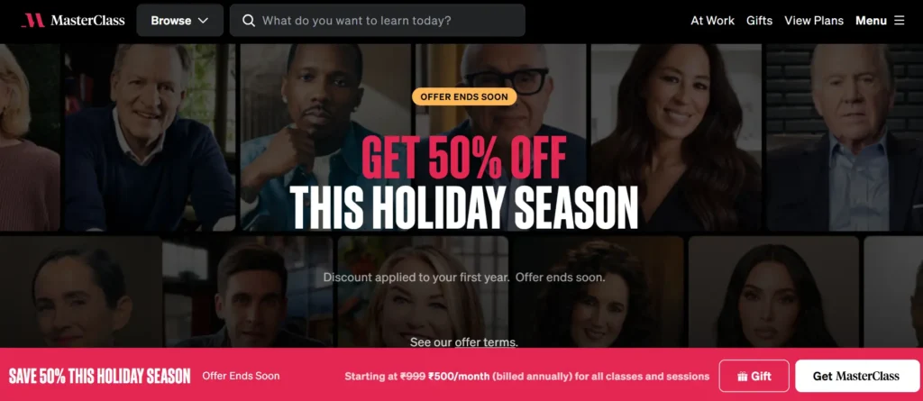 Before launching this Holiday Sale, MasterClass offered a Holiday head sale for early buyers, offering a 40% flat discount on all its membership plans.