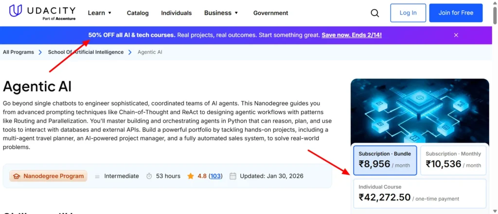 Let’s say, you want to enroll in Udacity’s Agentic AI Nanodegree Program (India)…the one-time payment (lifetime access): ₹84,545 (currently, it’s only ₹42,272 with 50% off)
